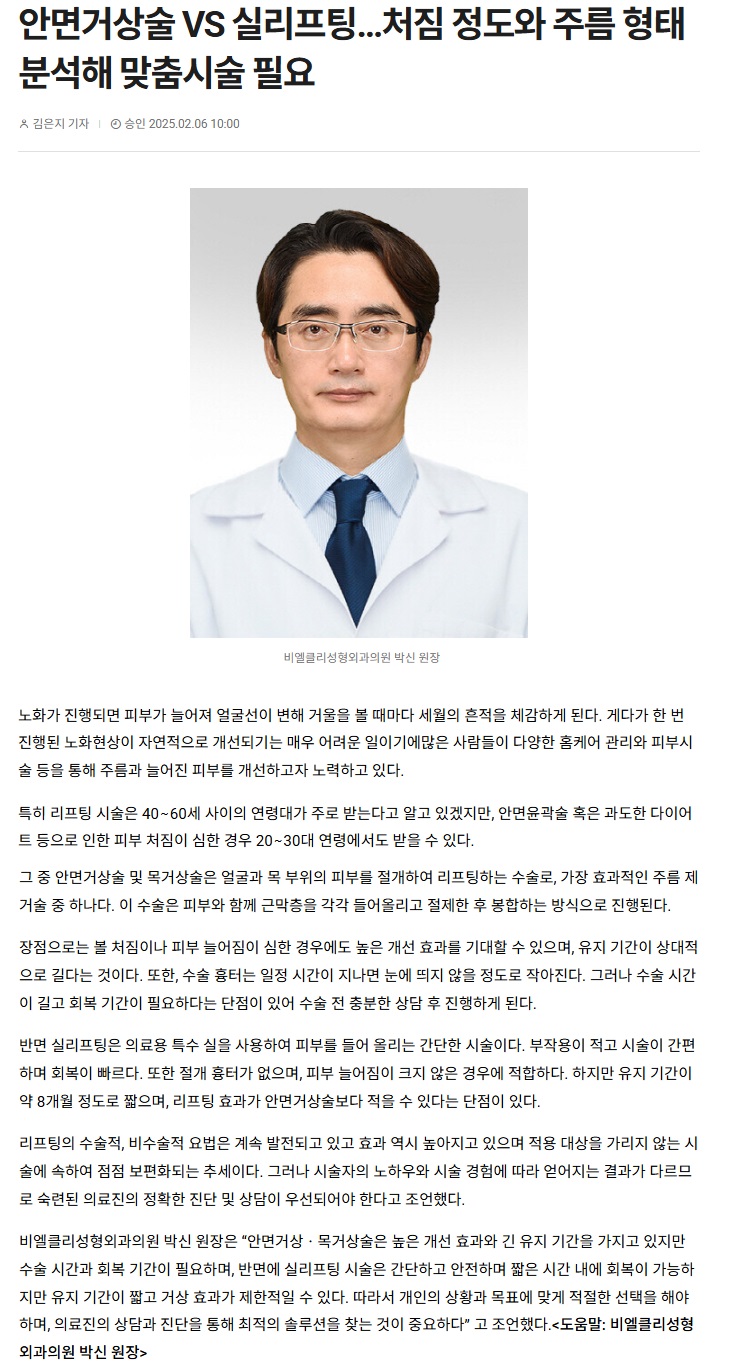 [언론보도] 안면거상술 VS 실리프팅…처짐 정도와 주름 형태 분석해 맞춤시술 필요