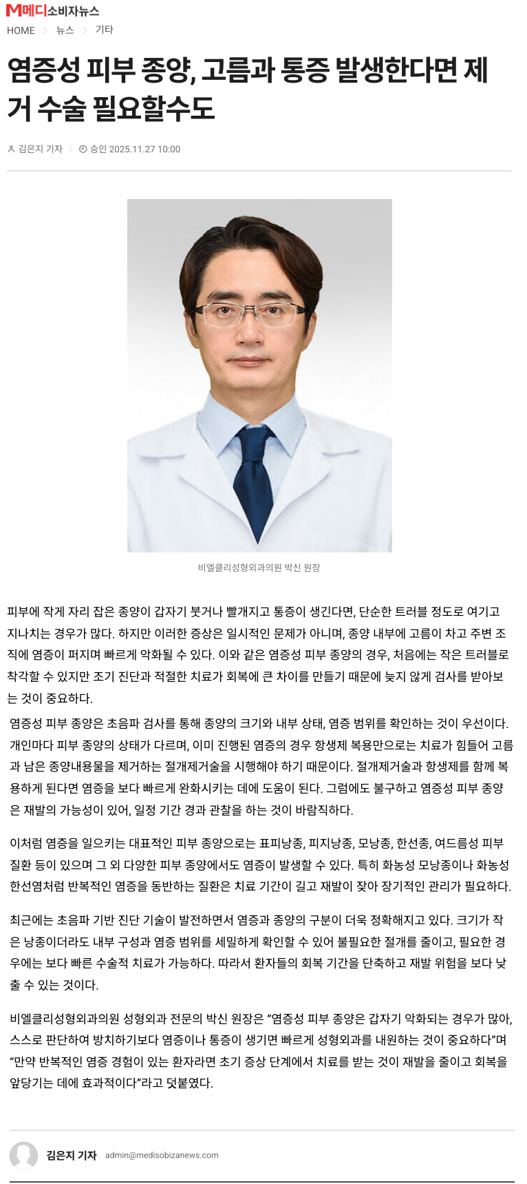 [언론보도] 염증성 피부 종양, 고름과 통증 발생한다면 제거 수술 필요할수도