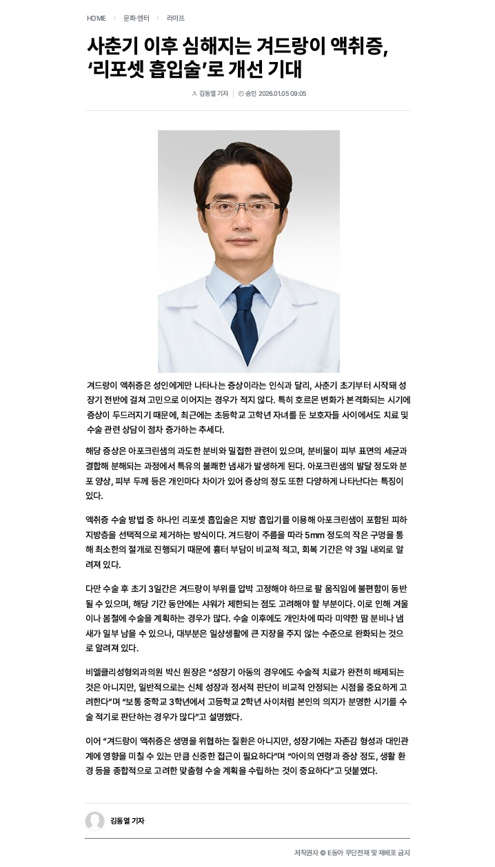[언론보도] 사춘기 이후 심해지는 겨드랑이 액취증, ‘리포셋 흡입술’로 개선 기대
