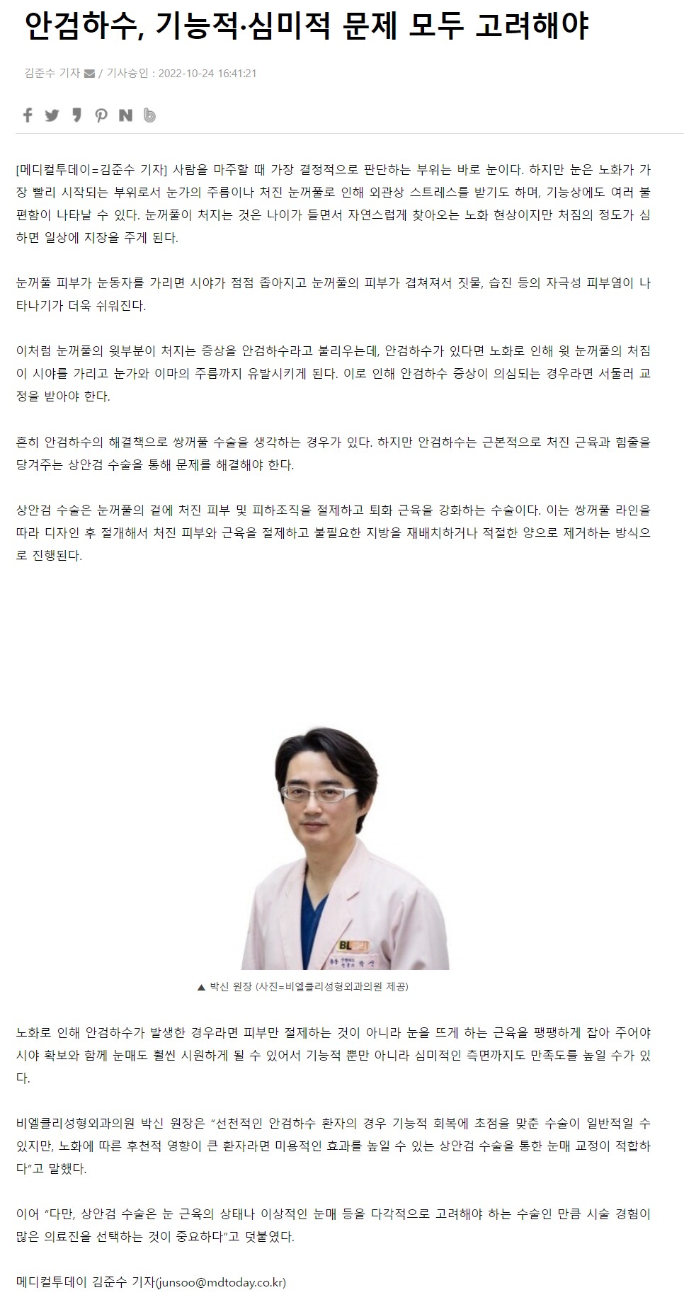 [언론보도] 안검하수, 기능적·심미적 문제 모두 고려해야
